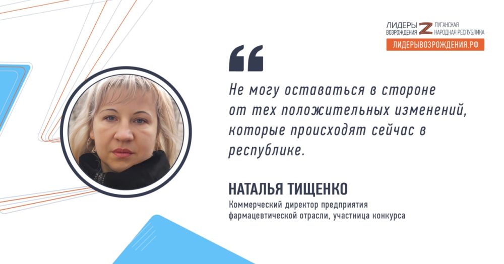 Коммерческий директор предприятия фармацевтической отрасли Наталья Тищенко прокомментировала свое участие в кадровом конкурсе «Лидеры возрождения. Луганская Народная Республика»: «Не могу оставаться в стороне от тех положительных изменений, которые происходят сейчас в республике. Конкурс восприняла как возможность заявить о себе, продемонстрировать свои способности и использовать собственный опыт. Сегодня много направлений, которые требуют обновления, в том числе и в сфере здравоохранения. Мне интересно фармацевтическое направление. Я работаю в этой отрасли много лет, занимаюсь прямыми продажами и вижу проблемы, которые необходимо проработать. Например, есть трудности в информационной работе с нашими докторами: в связи с переходом на новую систему здравоохранения и ОМС доктора загружены, не всегда оперативно получается изучить новую информацию. Сейчас много раненых, в основном все усилия направлены туда. Поэтому необходимо предложить врачам такую форму получения новых знаний, которая будет им удобна, не займет много времени и не станет обузой. Навыки работы в этом направлении у меня есть. Я быстро адаптируюсь».