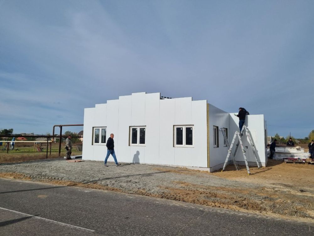 Специалисты из Волгограда возводят здание новой амбулатории. Стены модульного здания уже возведены. Теперь монтируются стены внутри утепляется контур снаружи.