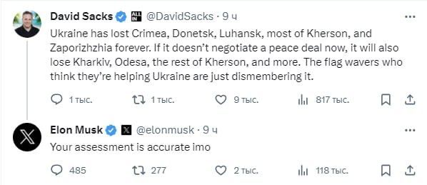 Илон Маск уверен, что Украина навсегда потеряла территории, занятые Россией, и потеряет ещё больше, если не остановится Миллиардер поддержал публикацию другого американского бизнесмена Дэвида Сакса в