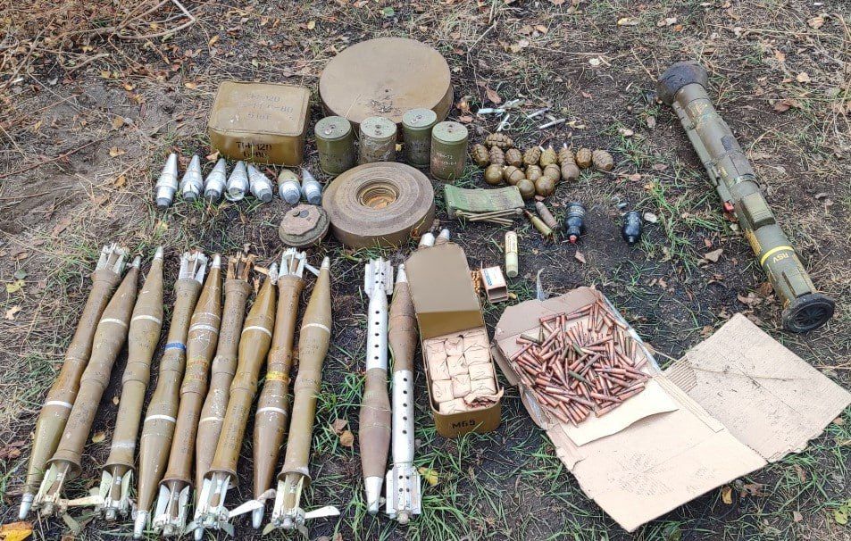 В ходе осмотра стражи правопорядка изъяли из схрона гранатомет иностранного производства АТ-4, осколочные боеприпасы ВОГ-25, ВОГ-17, более 15 ручных гранат (Ф-1, РДГ-1, РГН-2, РГД-5, Терен-6), 9 запалов УЗРГМ, противопехотные мины МОН-200 и МОН-50, более 10 боеприпасов к противотанковым гранатомётам, 12 мин ТМ-120, мины ТМ-62 и ОЗМ-72, а также порядка 600 патронов калибра 9 и 7,62 мм.