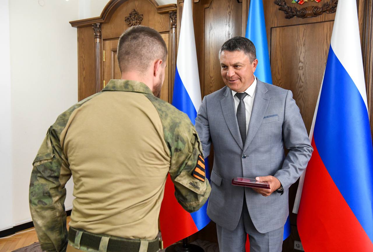 Глава ЛНР Леонид Пасечник отмечает заслуги военнослужащих.