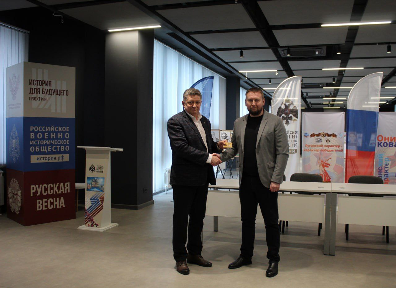 Председатель Народного Совета ЛНР, председатель регионального отделения Российского военно-исторического общества в ЛНР Денис Мирошниченко вручил членский билет общества председателю Совета городского округа Сергею Цемкало.