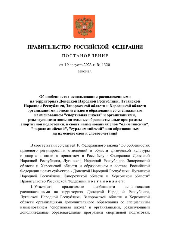 Правительством Российской Федерации утверждено Постановление от 10 августа 2023 года №1320 «Об особенностях использования расположенными на территориях Донецкой Народной Республики, Луганской Народной Республики, Запорожской области и Херсонской области организациями дополнительного образования со специальным наименованием «спортивная школа» и организациями, реализующими дополнительные образовательные программы спортивной подготовки, в своих наименованиях слов «олимпийский», «паралимпийский», «сурдлимпийский» или образованных на их основе слов и словосочетаний».