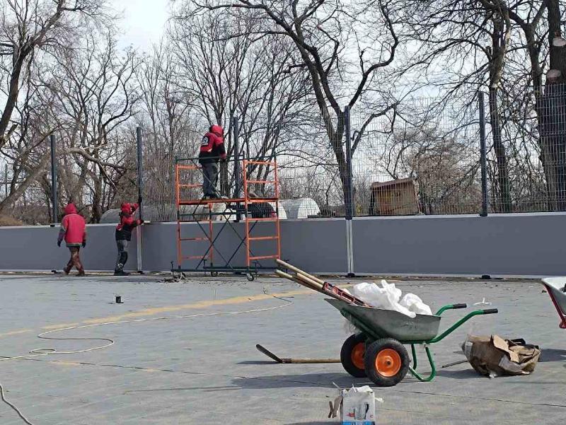В Краснодоне ЛНР продолжают возводить спортивную площадку: завезли травяное и резиновое покрытие