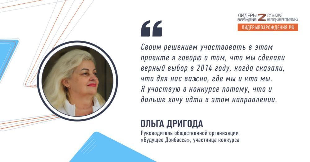 Руководитель общественной организации «Будущее Донбасса» Ольга Дригода прокомментировала свое участие в кадровом конкурсе «Лидеры возрождения. Луганская Народная Республика»: «События 2014 года серьезно изменили не только жизнь моего народа, но и мою лично. Она изменилась настолько сильно, что для меня вопрос об участии в конкурсе даже не стоял – оно абсолютно естественно. Своим решением участвовать в этом проекте я говорю о том, что мы сделали верный выбор в 2014 году, когда сказали, что для нас важно, где мы и кто мы. Я участвую в конкурсе потому, что и дальше хочу идти в этом направлении».