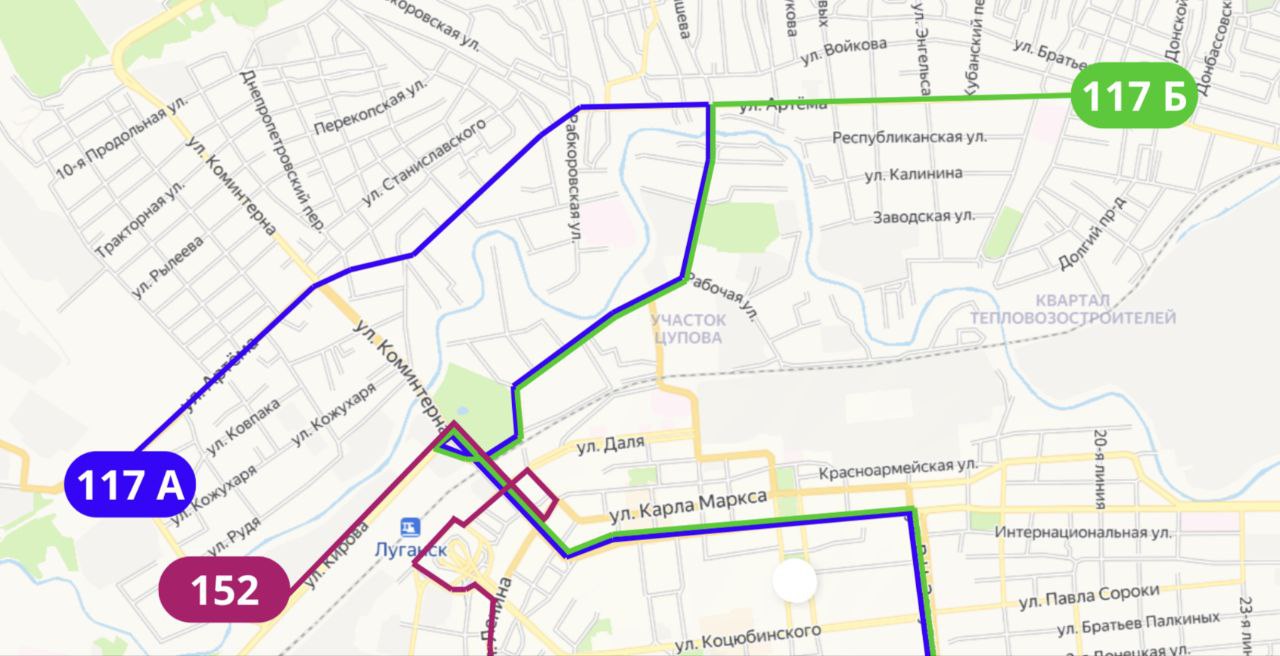 ➡ Маршрут 117 будет разделен на два 117А и 117Б – на пересечении ул. Артема и Карла Либкнехта будет расходиться, 117А будет идти на ул. 395 Шахтерской дивизии, а 117Б – в сторону пл. Ленина.